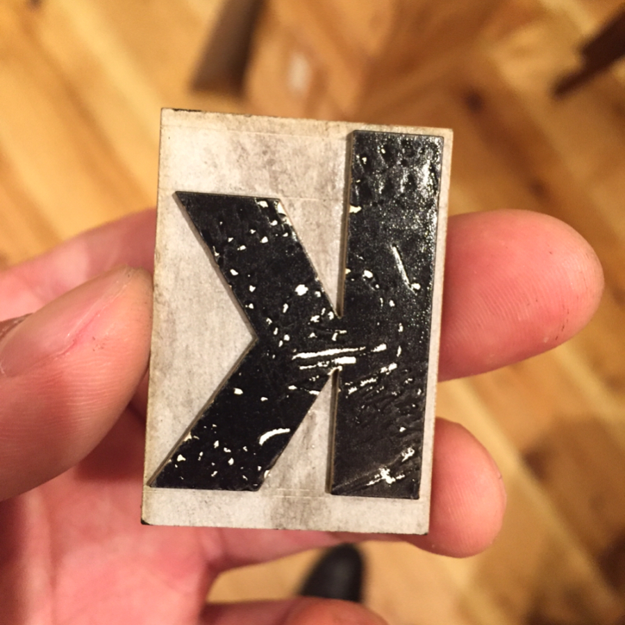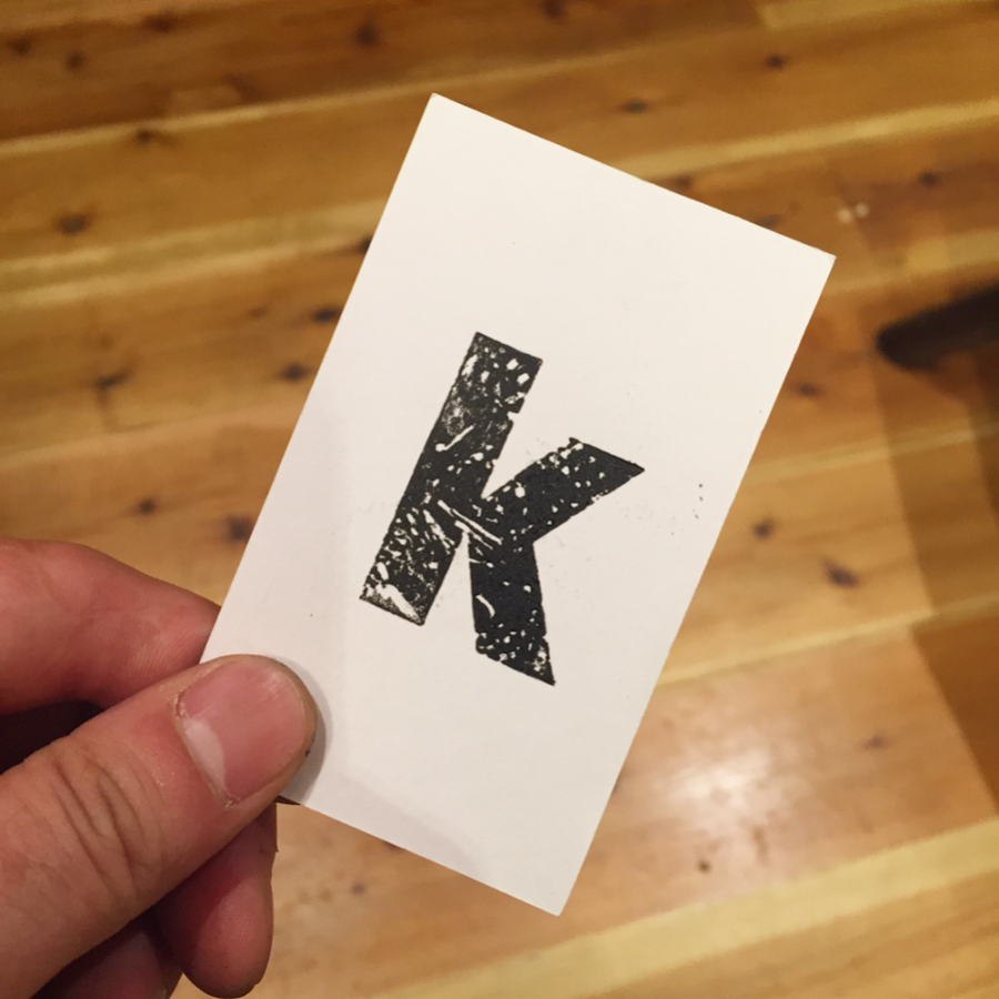 紙活字は表面に傷をつけたり、削ったりして自分のオリジナルを作れるのが特徴。今回は紙成屋の頭文字のkをミニカーを使って加工してみました。